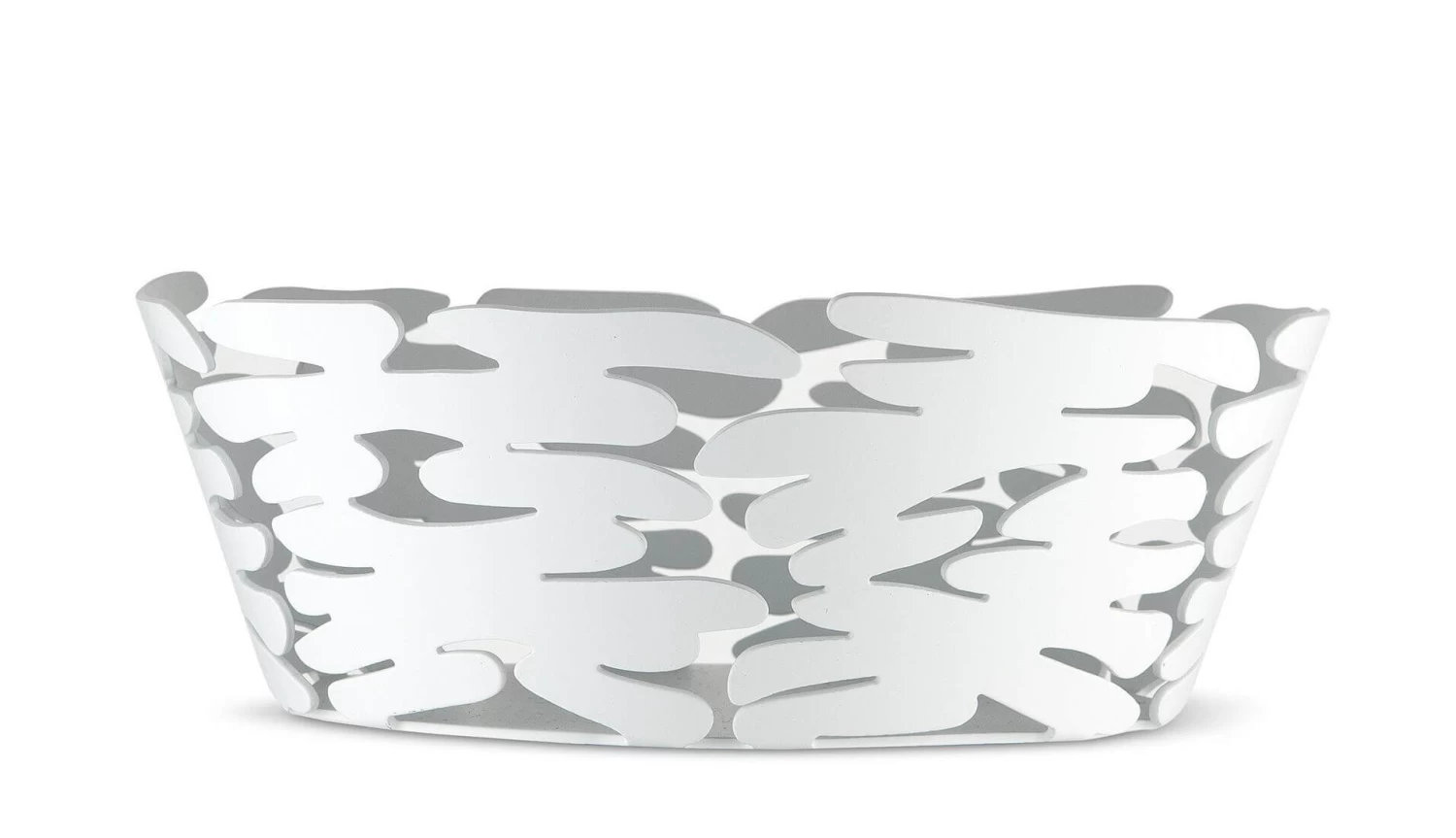 De Alessi Barket schaal is vervaardigd uit witkleurig gecoat, roestvrij staal. Het ontwerp van de schaal is gebaseerd op de schors van boom, is 6,5 cm hoog en heeft een diameter van 18 cm. Ontworpen door Michel Boucquillon en Donia Maaoui. Gebruik als bijvoorbeeld een fruitschaal of broodmand.