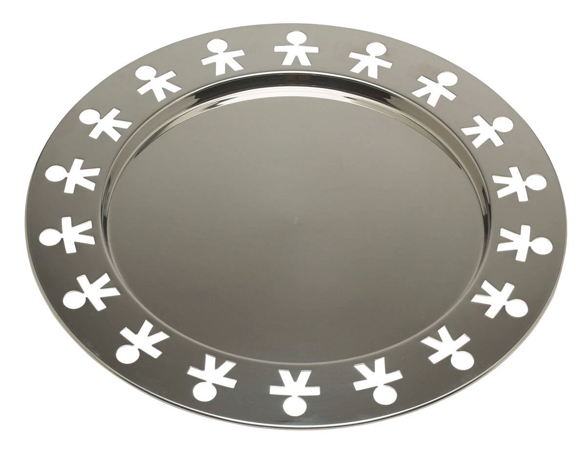 Dit Girotondo dienblad van Alessi is gemaakt van hoogglanzend roestvrij staal en heeft een diameter van 40 cm. Het blad is ontworpen door King-Kong en is in de rand versierd van de typische Girotondo mannetjes.