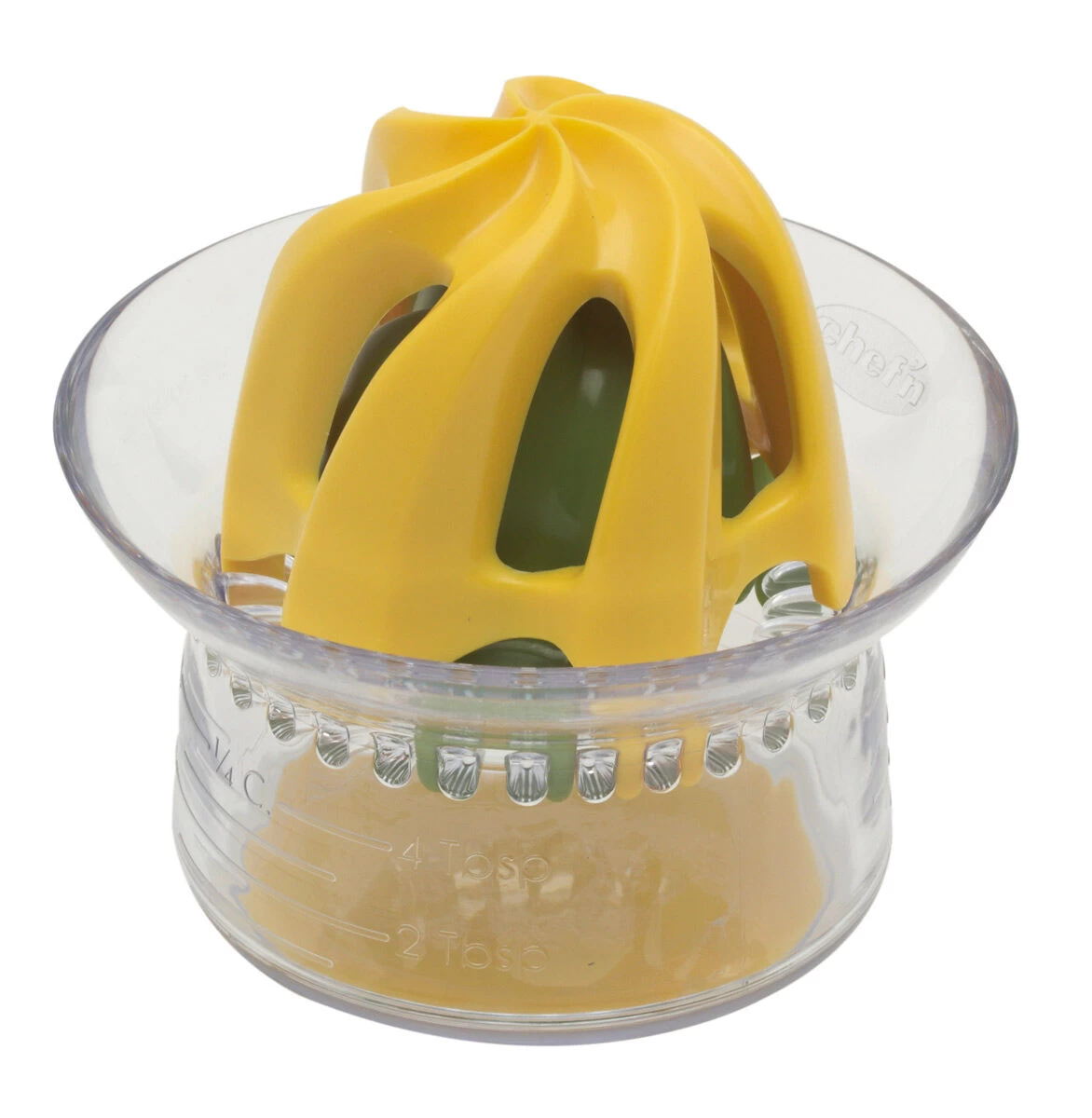 De Chef’n Juicester Jr. is een compacte citruspers voor het uitpersen van limoen- en citroensap. De pers is voorzien van een dubbele kegel: de grote gele voor citroen en een kleine groene voor limoen. Het opvangbakje is voorzien van een pulpzeef en een maatverdeling in eetlepels.