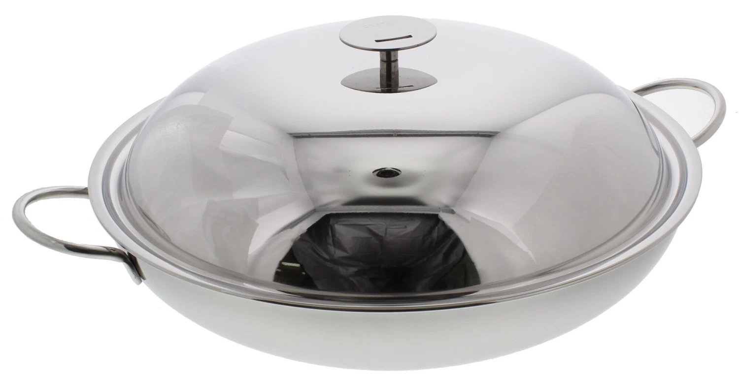 De Cristel Compléments wok heeft een diameter van 38 cm en is gemaakt van roestvrij staal aan de binnen- en buitenzijde. Daar tussen bevindt zich een laag aluminium voor een goede warmtegeleiding. De pan heeft een inhoud van 7 liter en is 11 cm hoog. De geronde wanden en de kleine bodem maken de pan goed geschikt om in te wokken en te roerbakken. Via de gebogen schenkrand kunt u de inhoud van de wok uitschenken. De wok wordt geleverd met een halfrond draadrooster, een spatel en een roestvrijstalen deksel. Gebruik de pan op alle warmtebronnen of in de oven.