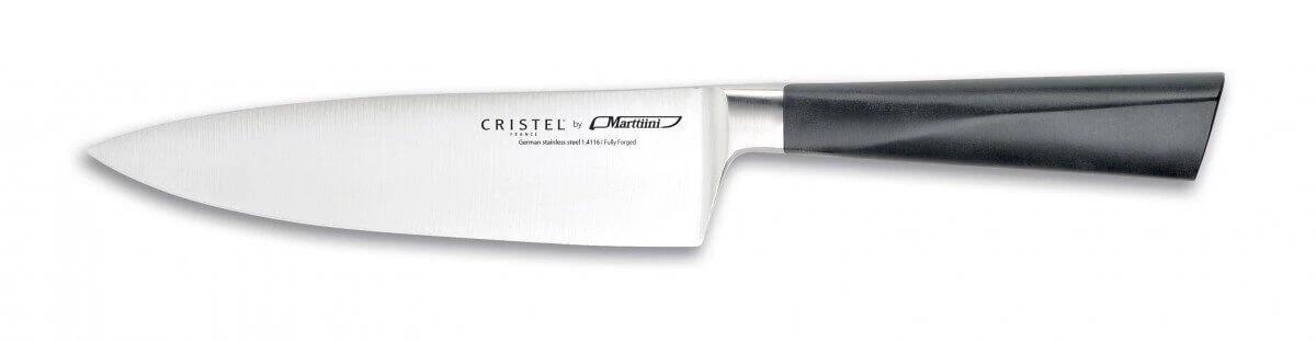 Voor de messenlijn heeft het Franse pannenmerk Cristel de hulp ingeroepen van het Finse Marttiini, dat sinds 1928 messen produceert. Het staal dat gebruikt wordt voor de messen wordt in het Duitse Solingen gesmeed. De kunststof greep is eenvoudig in onderhoud en erg robuust. Elk van de messen heeft voor het heeft een zogeheten krop, waardoor zich geen vuil kan ophopen tussen lemmet en heft, en de gewichtsverdeling van het mes prettig is. De Cristel Marttiini messen worden geleverd met een beschermhoes om het lemmet en uw vingers te beschermen.
