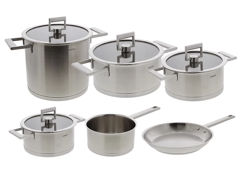 De pannen van de serie Strate van het Franse merk Cristel zijn voorzien van een extra dikke bodem. In de bodem zit een aluminium plaat die de warmte gelijkmatig over de bodem verdeelt. Uniek aan deze serie is dat de dikke aluminiumlaag in een L-vorm de hele bodem van de pan omkapselt. Buiten deze laag heeft de pan een roestvrijstalen bodem die voor goede verwarming op een inductiekookplaat zorgt. Een deel van de pannen en deksels heeft vaste grepen en een deel heeft losse grepen die van de pan gehaald kunnen worden zodat deze compacter wordt.
