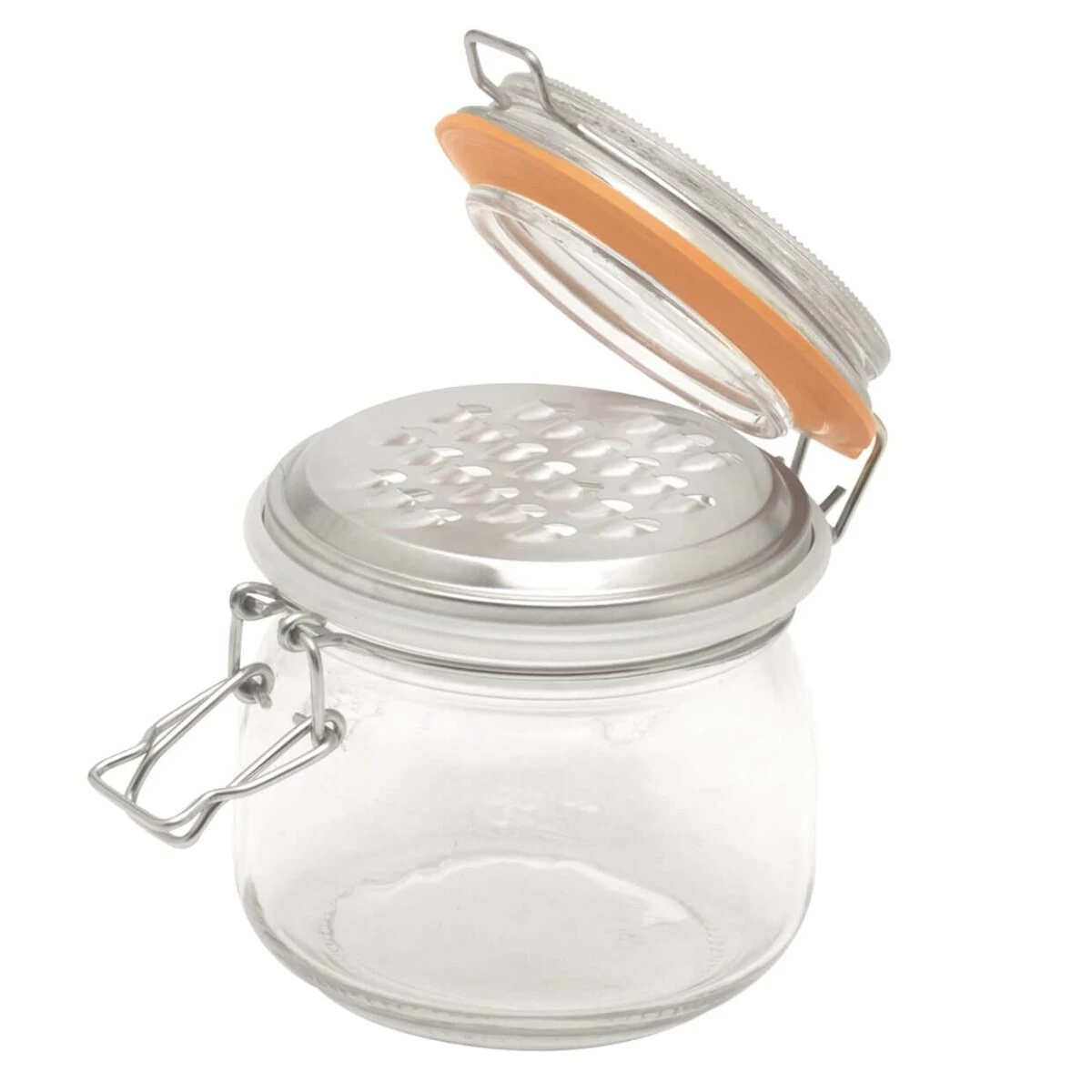 De Kilner Grater Jar raspset is voorzien van een Kilner weckpot met beugel en een aparte raspschijf. De weckpot is gemaakt van glas met een roestvrijstalen beugel en siliconen afsluit ring. De glazen pot heeft een inhoud van 500 ml, diameter van 15 cm en hoogte van 16 cm. De raspschijf is gemaakt van roestvrij staal, voorzien van grove perforaties en heeft een diameter van 15 cm. De raspschijf is verwijderbaar en kunt u ook gebruiken op andere Kilner potten met dezelfde diameter als de schijf.