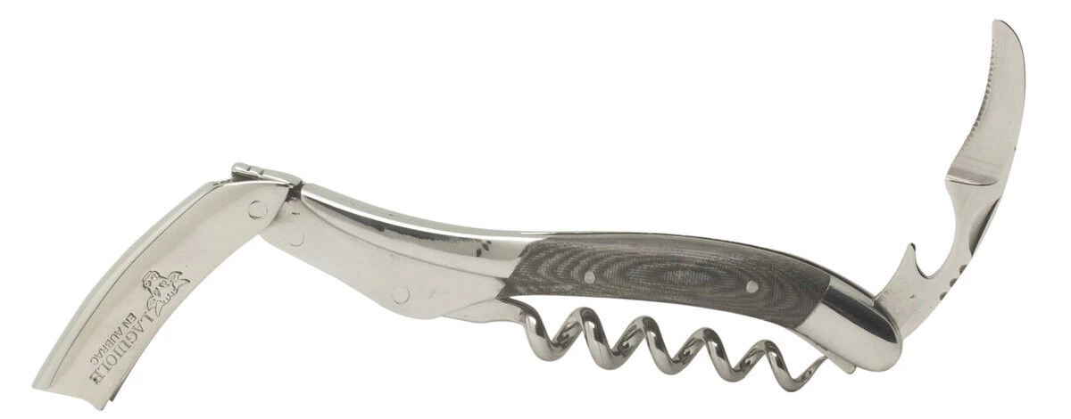 Het Laguiole en Aubrac kelnersmes is vervaardigd uit messenstaal met een heft van grijs canvas. Ingeklapt is het mes 12 cm lang. Het zakmes is met de hand gemaakt in Aubrac in Frankrijk en bevat een kurkentrekker, klein kartelmesje en flessenopener. Gebruik het kelnersmes om flessen wijn, bier of champagne te openen.