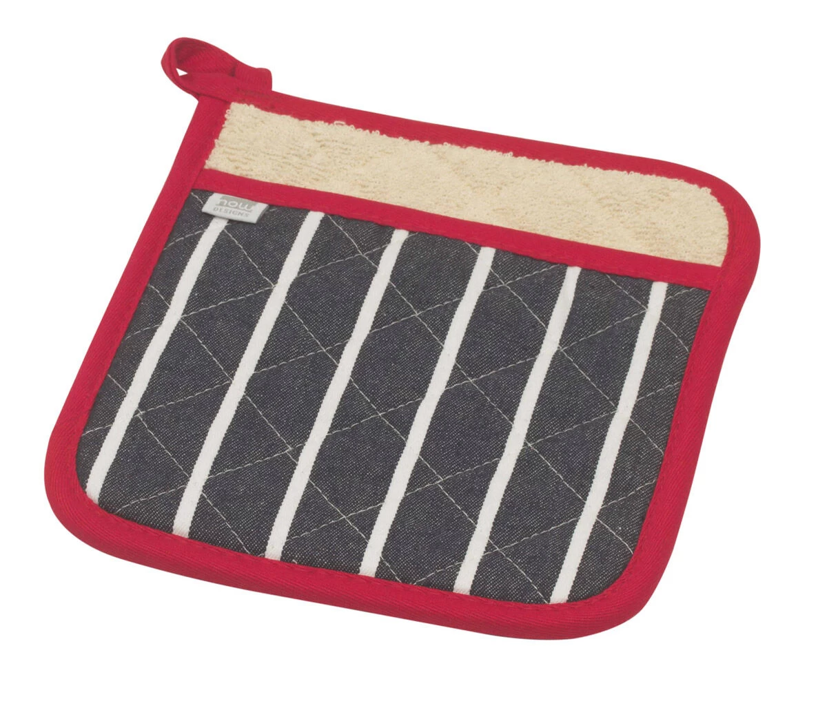 De blauwe Now Designs pannenlap is gemaakt van 100% katoen en is voorzien van witte brede strepen en een rode rand. De pannenlap gebruikt u voor uw handen ter bescherming van hitte van pannen of ovenschalen. De pannenlap is 20 x 20 cm.