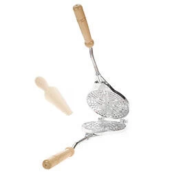 De Oldenhof ijswafelijzer is vervaardigd uit gietaluminium en heeft houten handgrepen. Het oublie-ijzer gebruikt u op open vuur of op het gasfornuis. U maakt zowel platte wafels als hoorntjes met het houten hulpstuk.