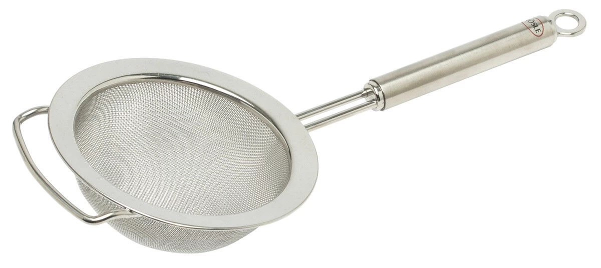 De bolzeef van Rösle is van roestvrij staal en is voorzien van een ophangoog en tegengreep. De zeef heeft een totale lengte van 29 cm en een diameter van 12 cm. Gebruik de Rösle zeef voor het zeven van bijvoorbeeld thee, bloem en bouillons.