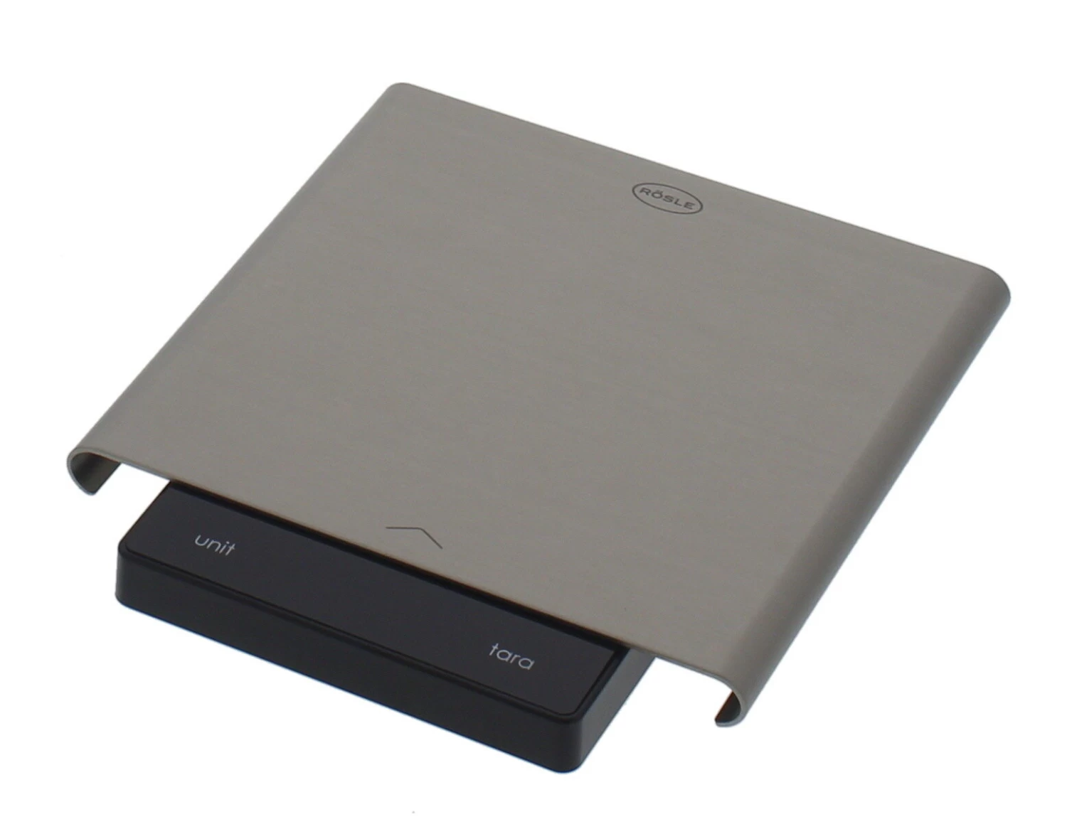 De digitale weegschaal van Rösle is vervaardigd uit roestvrij staal en ABS kunststof. De weegschaal is 17,8 cm breed en 17 cm diep en kan tot 5 kg wegen met 1 gram precisie.