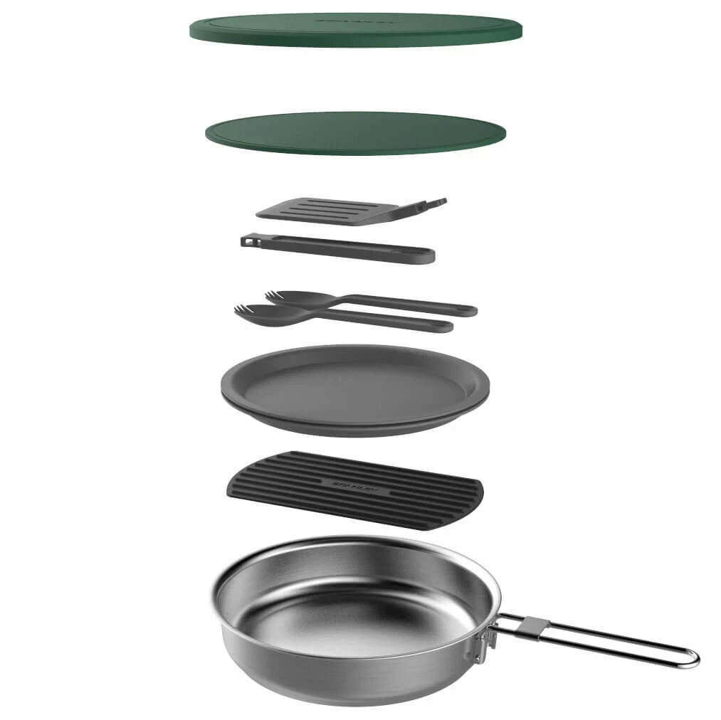 De Stanley Adventure Prep + Eat set bevat alles wat u nodig heeft om voor twee personen een maaltijd te bereiden. De compact samengestelde set bestaat uit 9 onderdelen waarmee u in een handomdraai een maaltijd bereidt of opwarmt. Alle delen zijn stapelbaar in de pan en besparen hierdoor kostbare ruimte. De set heeft een afmeting van 21 cm x 6 cm en de onderdelen zijn gemaakt van roestvrij staal en BPA-vrij kunststof.