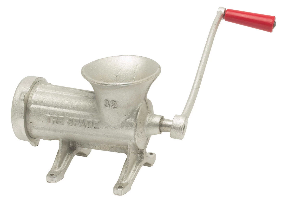De Tre Spade vleesmolen nummer 32 is een handvleesmolen gemaakt van vertind gietijzer met een plaatdiameter van 10 cm. Het mes en de plaat zijn gemaakt van roestvrij staal. De gehaktmolen is voorzien van montagegaten waarmee de molen vastgeschroefd wordt op het werkblad. De hele molen is 38 cm lang, 18 cm breed en 40 cm hoog.