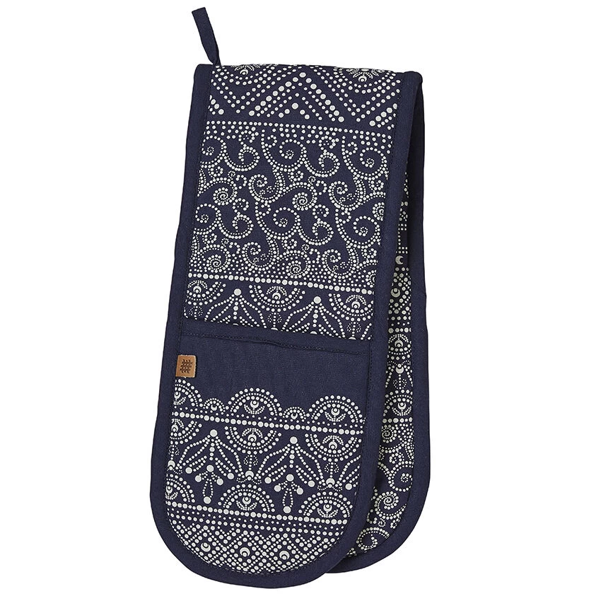 De donkerblauwe lange pannenlap van Ulster Weavers is vervaardigd van katoen en voorzien van een polyester vulling voor isolatie en bescherming. De pannenlap is vormgegeven met een Indigo Batik print, een handig ophangoog en twee brede steekvakken. Gebruik de pannenlap om hete pannen van het fornuis of uit de oven te pakken. De pannenlap is 88 cm lang en 18 cm breed.