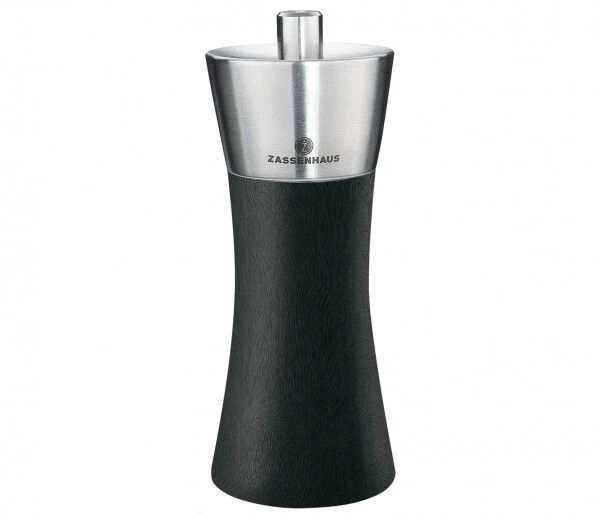 De Zassenhaus Augsburg zoutmolen is vervaardigd uit zwart gebeitst hout, heeft een zandloper figuur en is 14 cm hoog. De zoutmolen is afgewerkt met roestvrij staal en heeft een keramische maalwerk.