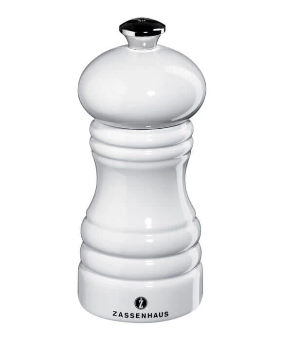 De Zassenhaus Berlin-pepermolen in de kleur glanzend wit heeft een klassiek uiterlijk. De pepermolen is glanzend wit gelakt en heeft een keramisch maalwerk. De pepermolen van Zassenhaus is 12 cm hoog.