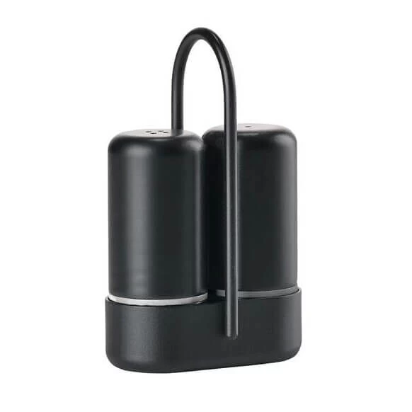 Met het zwarte Zone Denmark Singles peper- en zoutstel past u ieder gerecht gemakkelijk aan naar eigen smaak. De kunststof set bestaat uit een pepervaatje, zoutvaatje en houder met een handige greep. Dankzij de markering aan de bovenzijde zijn de verschillende vaatjes gemakkelijk te onderscheiden. De complete set heeft een afmeting van 6,5 x 3 x 9 cm. Gebruik het Zone Denmark Singles peper- en zoutstel voor het serveren en strooien van peper en zout.